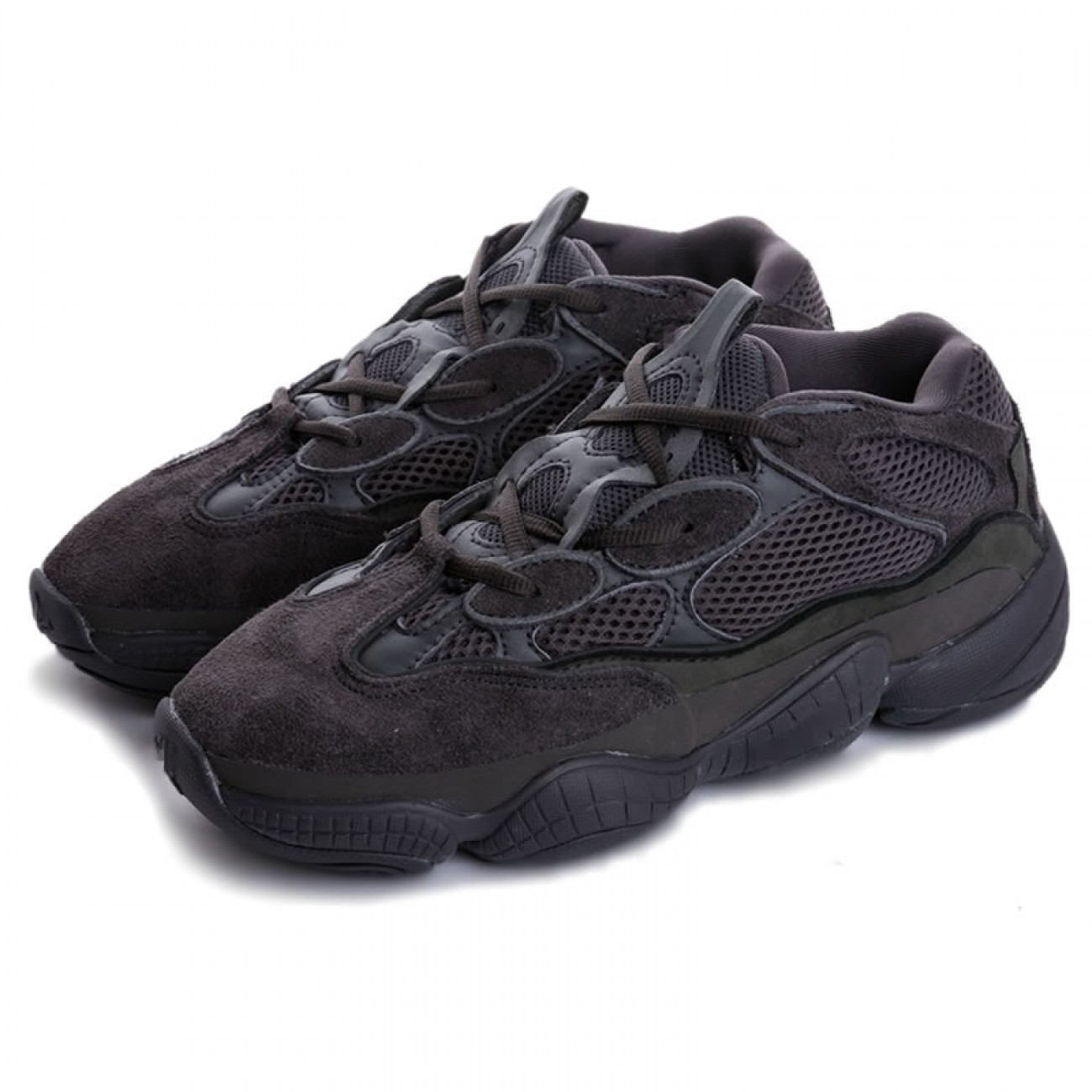 Dressed in a “Triple Black” color scheme. This adidas Yeezy Desert Rat 500 comes in a mix of mesh, suede and leather that rests atop its signature chunky midsole.