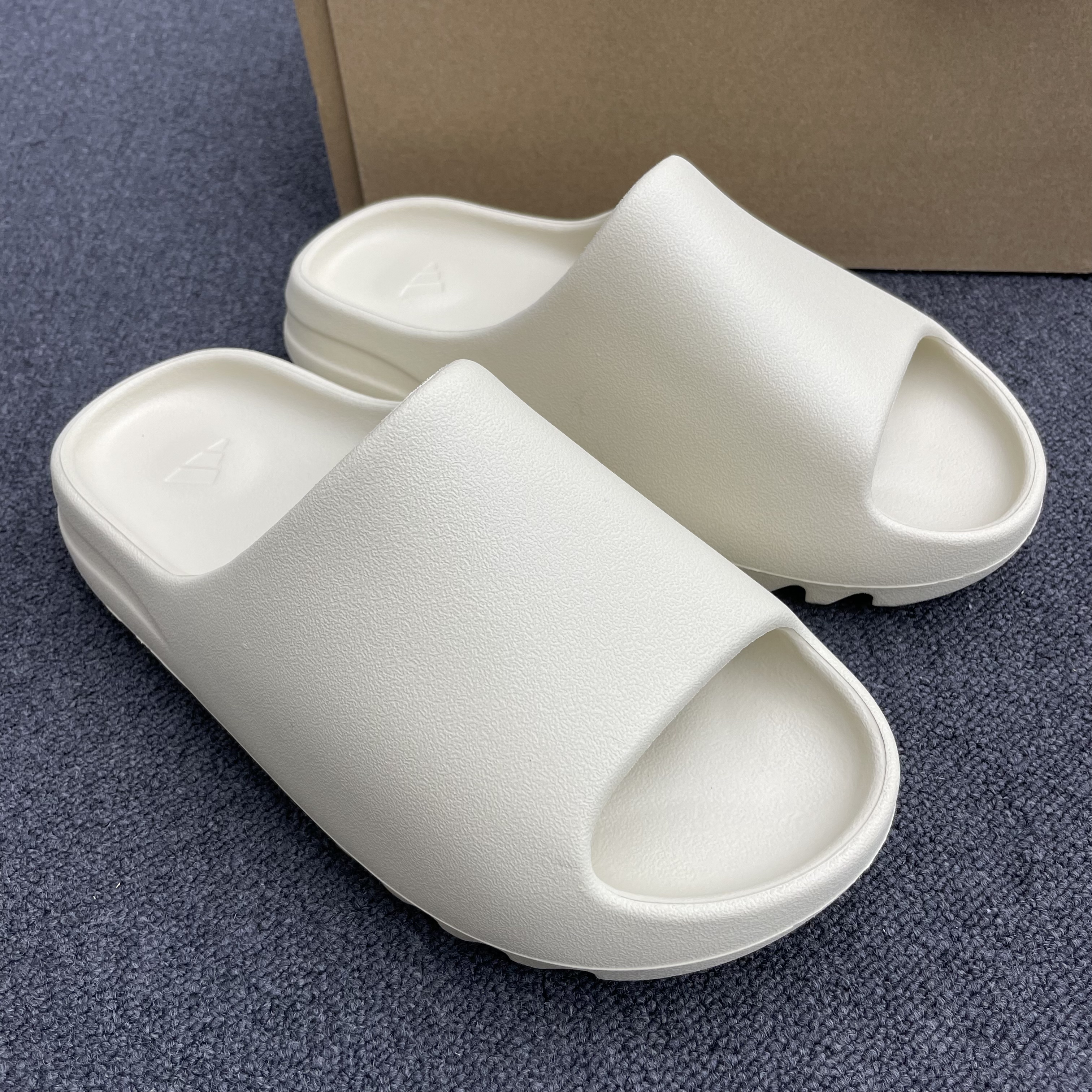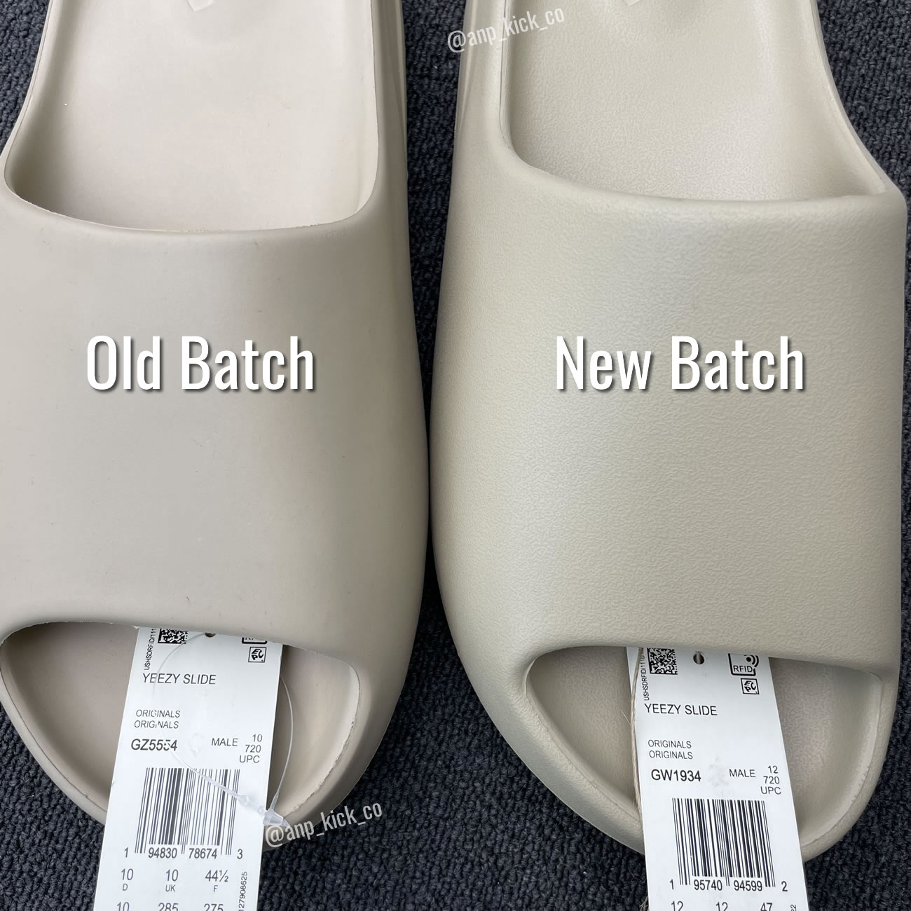 Yeezy slides new updated material has come, and we will ship this new batch material in the next, it is a more environmentally friendly material for the frosted surface, the following are comparison videos & pics of the old and new batch: