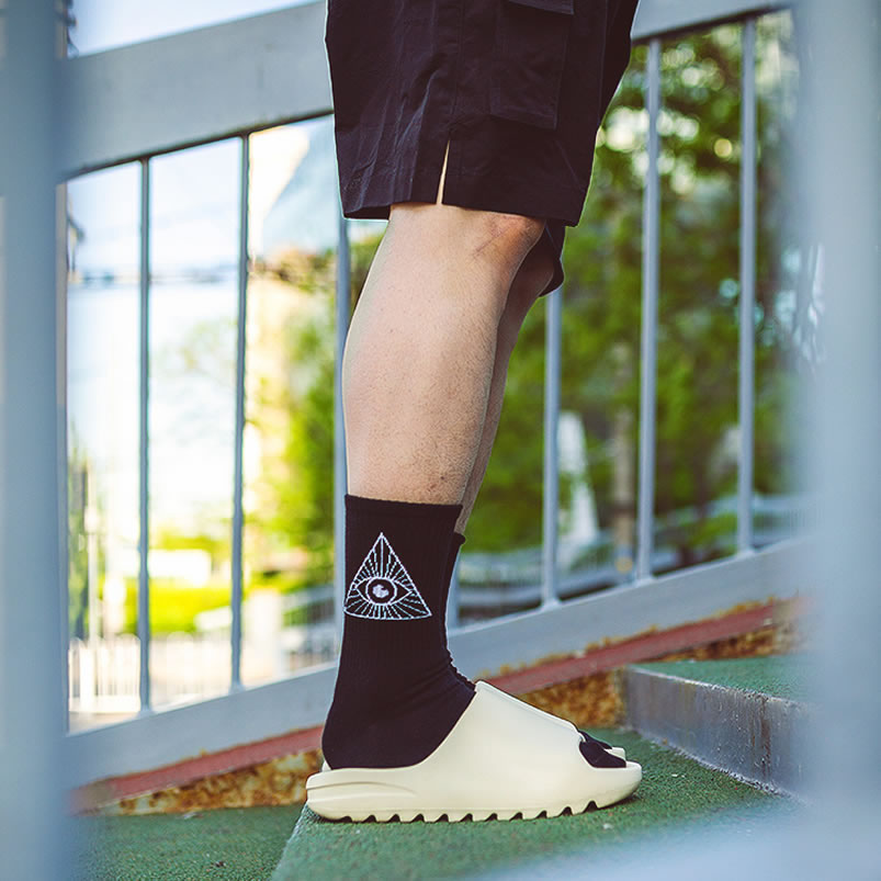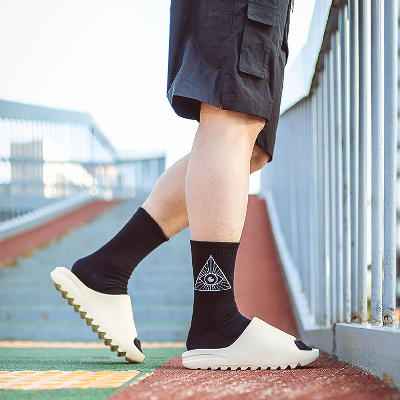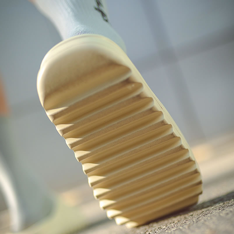 Originally thought that the thick Yeezy Slide shoe shape will cause the entire pair of feet to drag too much, but the single weight is only about 210 grams (US9), which can be said to be a hidden surprise. At the same time, the inside is designed to fit the arch of the foot, no matter whether you wear socks after the foot, you can have a good sense of support and will not slip off easily. The outsole pattern is presented with a zigzag shape, which not only brings a full outdoor style in visual effect, but also makes the sole of the entire pair of shoes more durable.